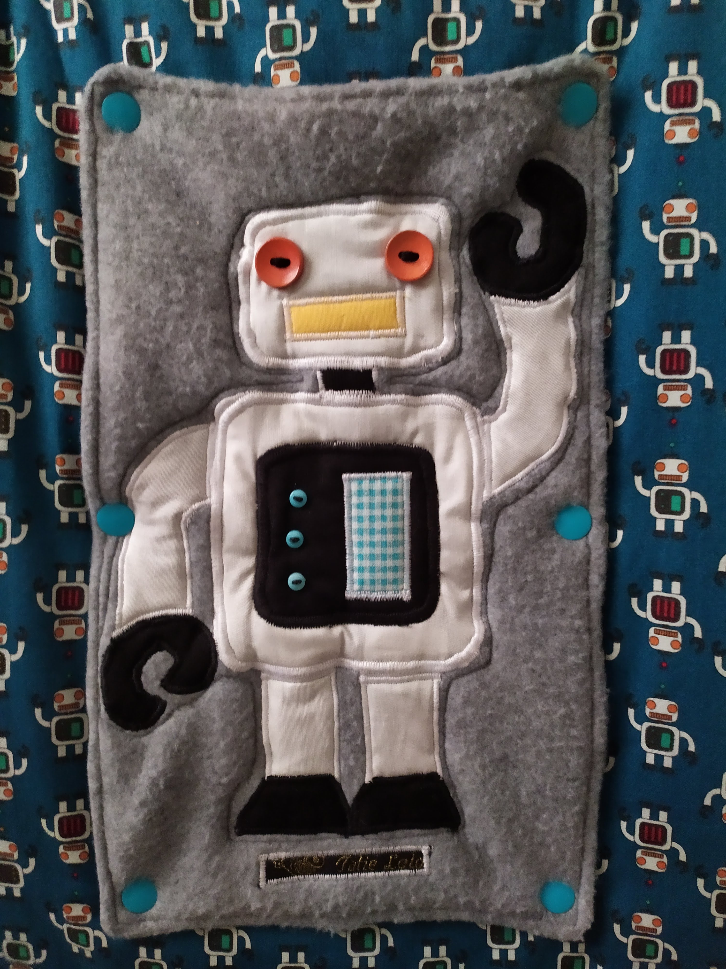 Extérieur coton, intérieur éponge bambou oeko-tex, une pression plastique. Lavable en machine à 40°