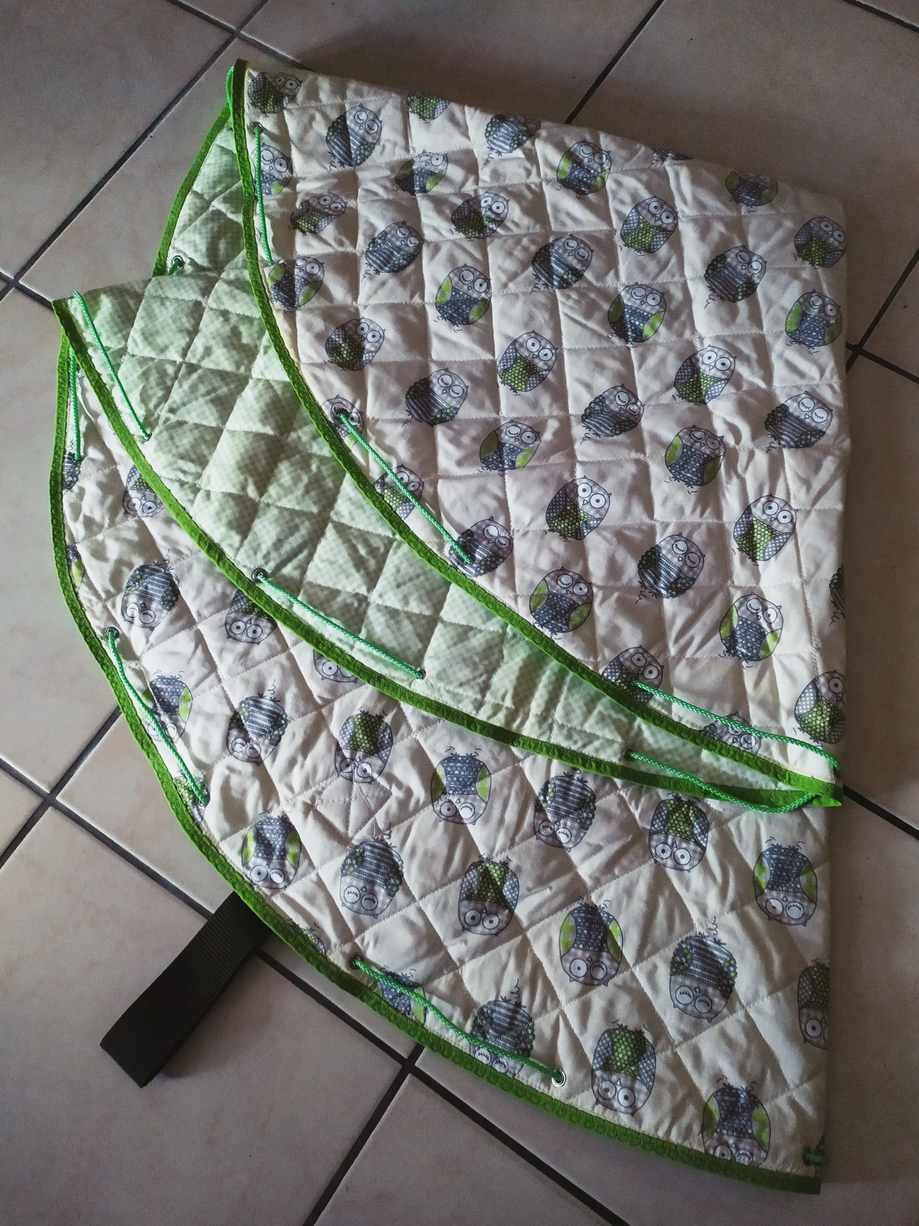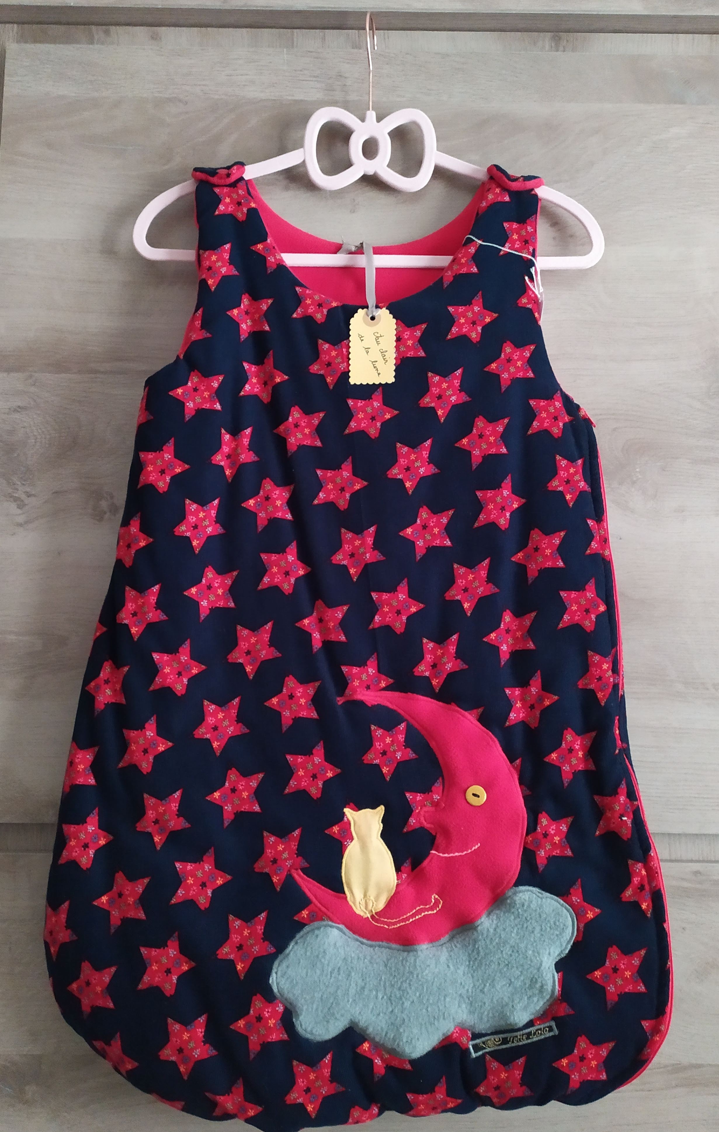 Extérieur 100% coton, intérieur polaire, fermeture latérale zippée, 2 pressions au niveau des épaules. Lavable en machine à 40°.