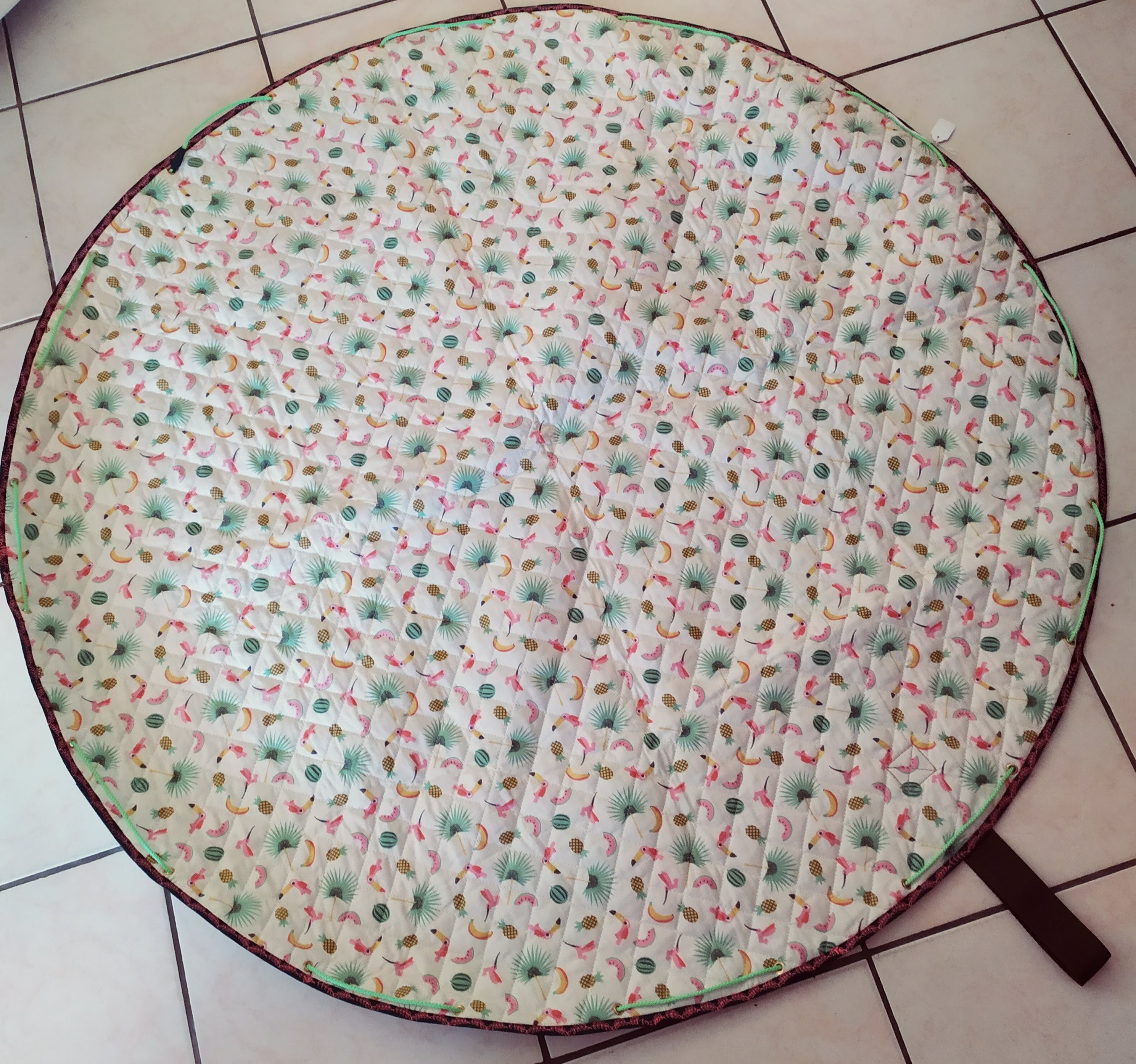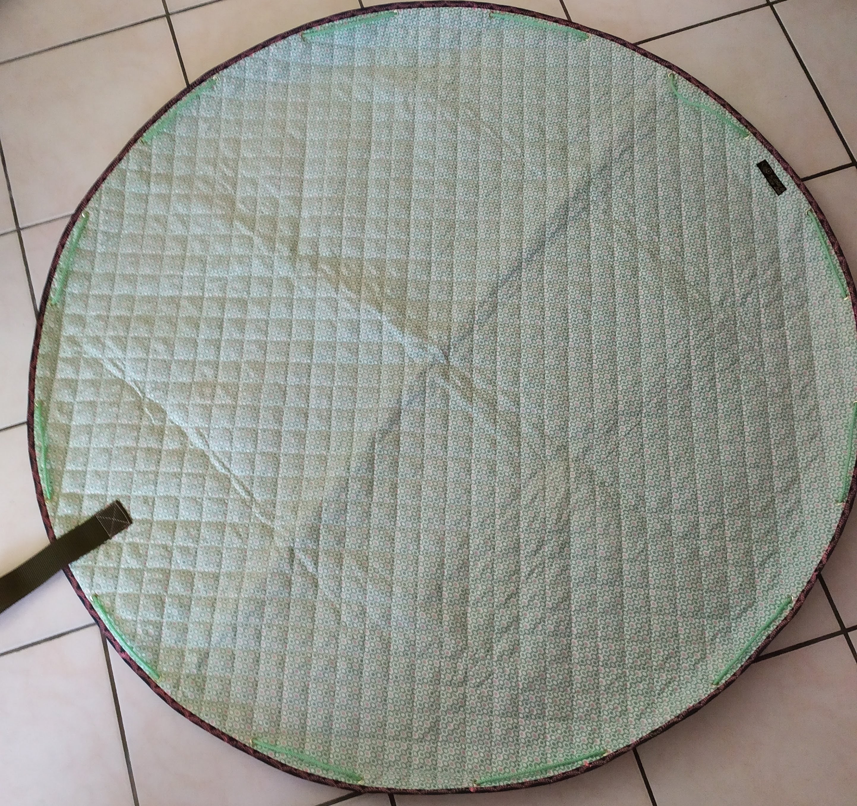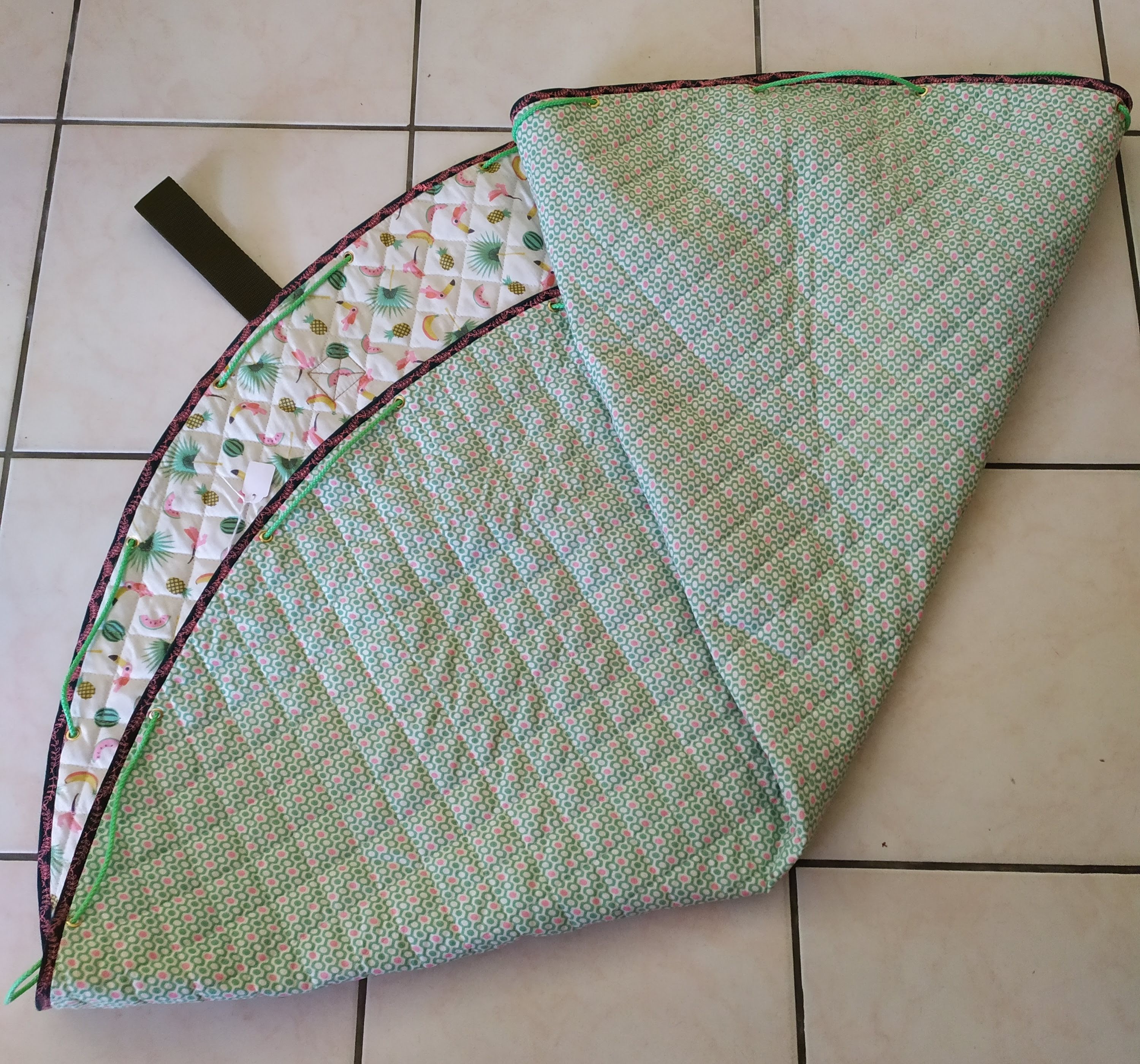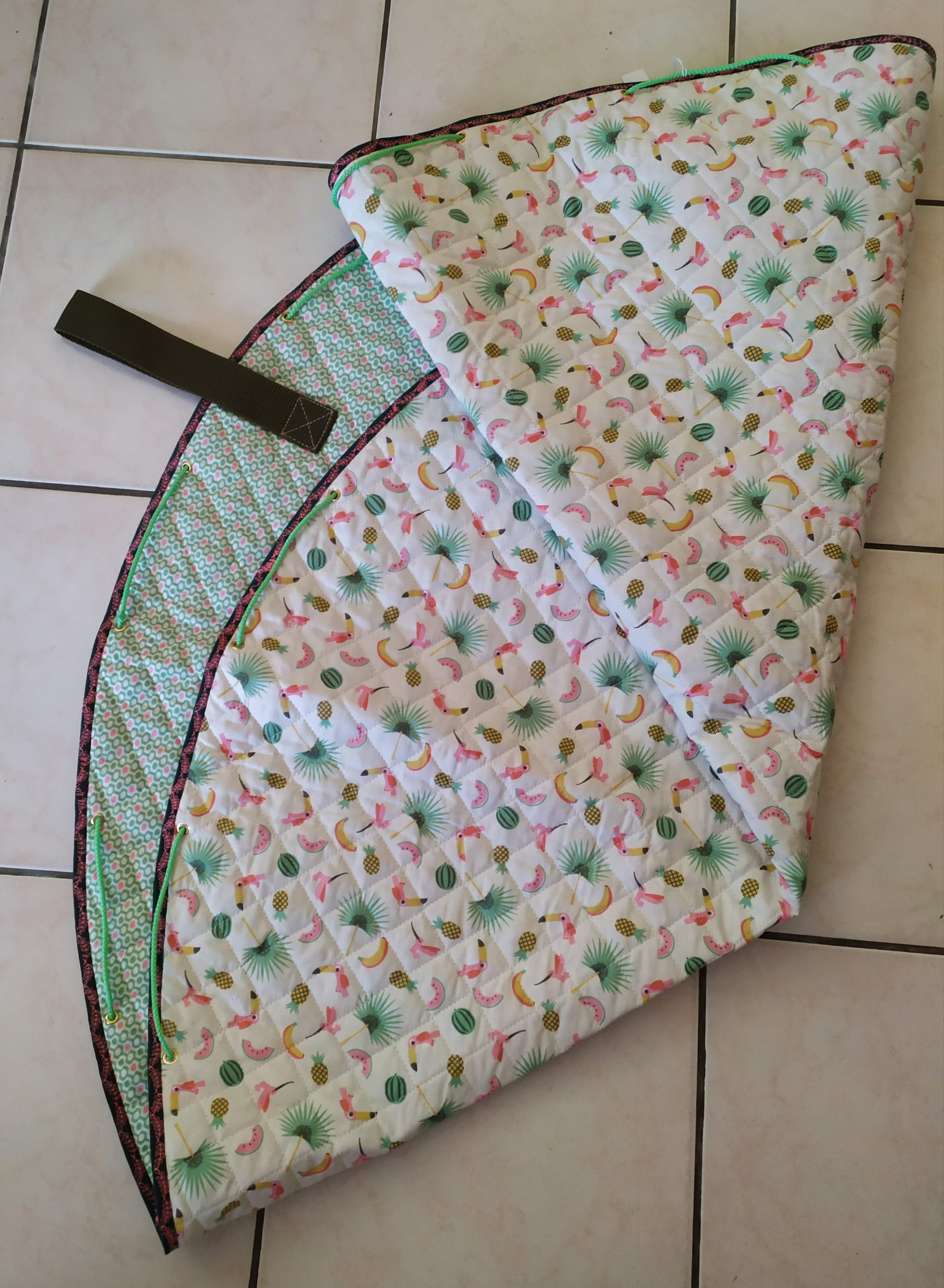 Tapis rond en coton matelassé, transformable en sac de transport pour les accessoires ou les jouets de bébé. Très utile pour déplacer bébé et ses affaires d’une pièce ou d’un lieu à un autre. Lavable en machine.
